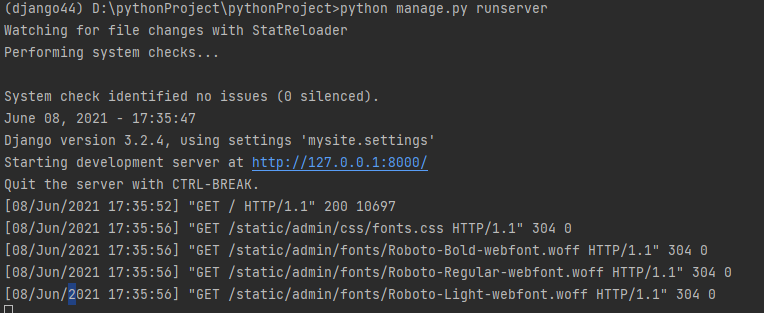 manage.py가 있는 경로에서 runserver를 입력한다.