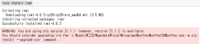 만약 오류가 뜬다면 이대로 입력해주자! 주피터 노트북에서는 코드 앞에 !을 붙이면 된다. cmd로 할 경우 !을 빼면 된다.