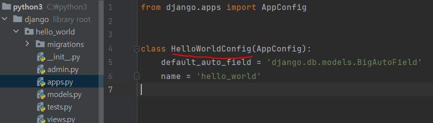 apps에 들어가면 HelloWorldConfig 클래스가 자동 생성됨을 확인할 수 있는데