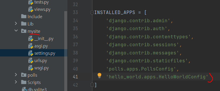 이전 포스팅에 생성한 mysite(프로젝트) - urls.py에 path를 이용하여 hello_world를 추가한다.
