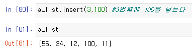 다음은 insert()를 이용하는데 insert는 몇번째에 어떤 값을 넣을지 지정할 수 있다.