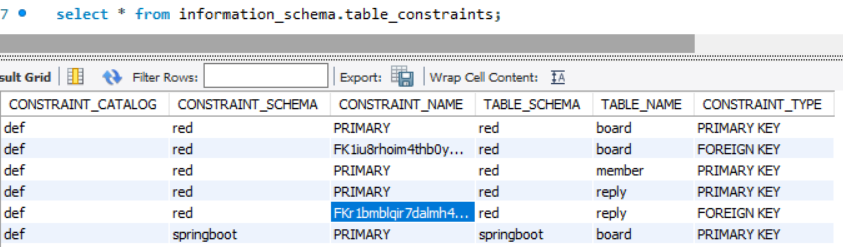foreign key 이름을 보기 위해서 밑에 코드를 실행하고