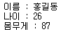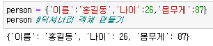 person = {'이름':'홍길동','나이':26,'몸무게':87}
